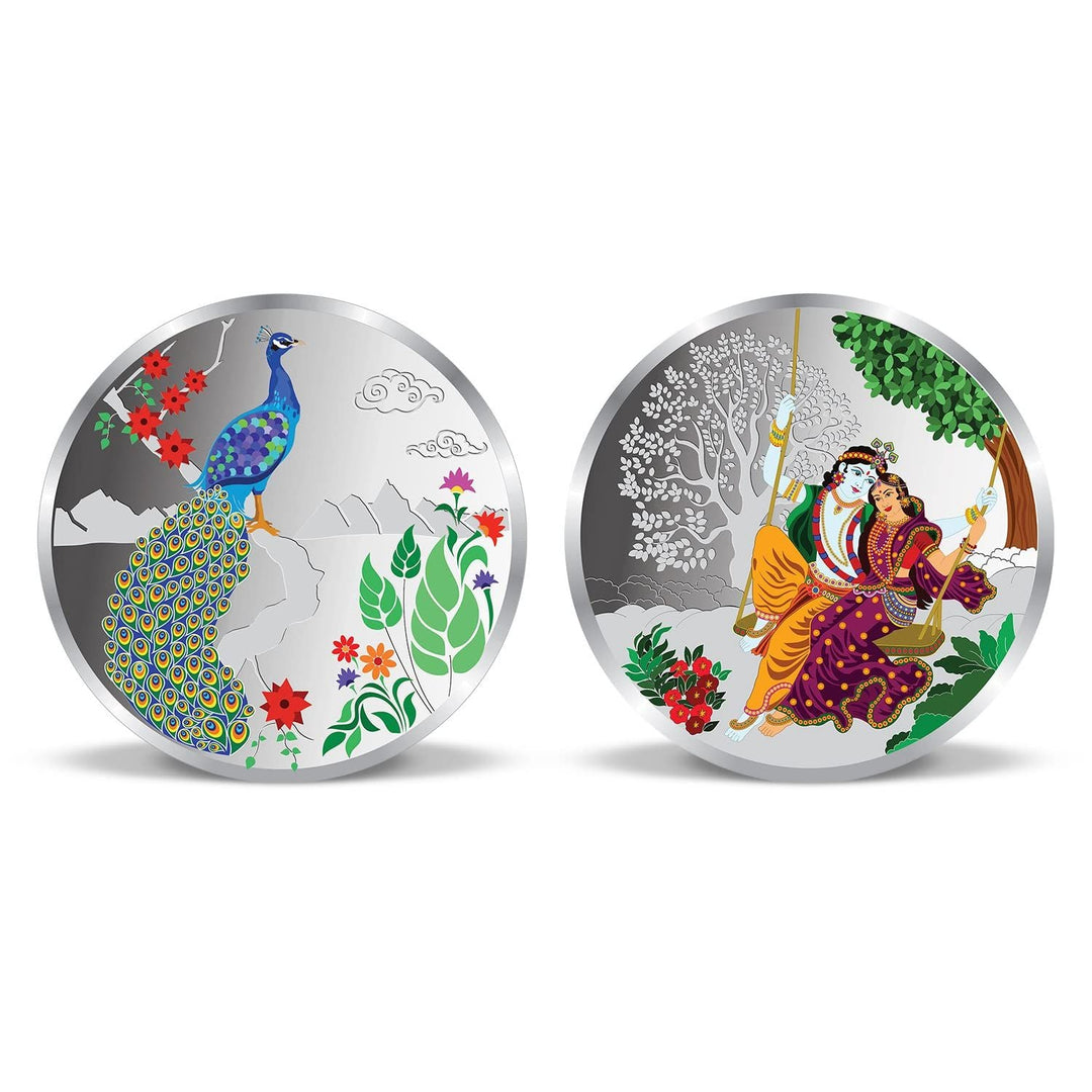 BIS Hallmarked Radha Krishna Colourful Peacock Silver Coin 999 Pure