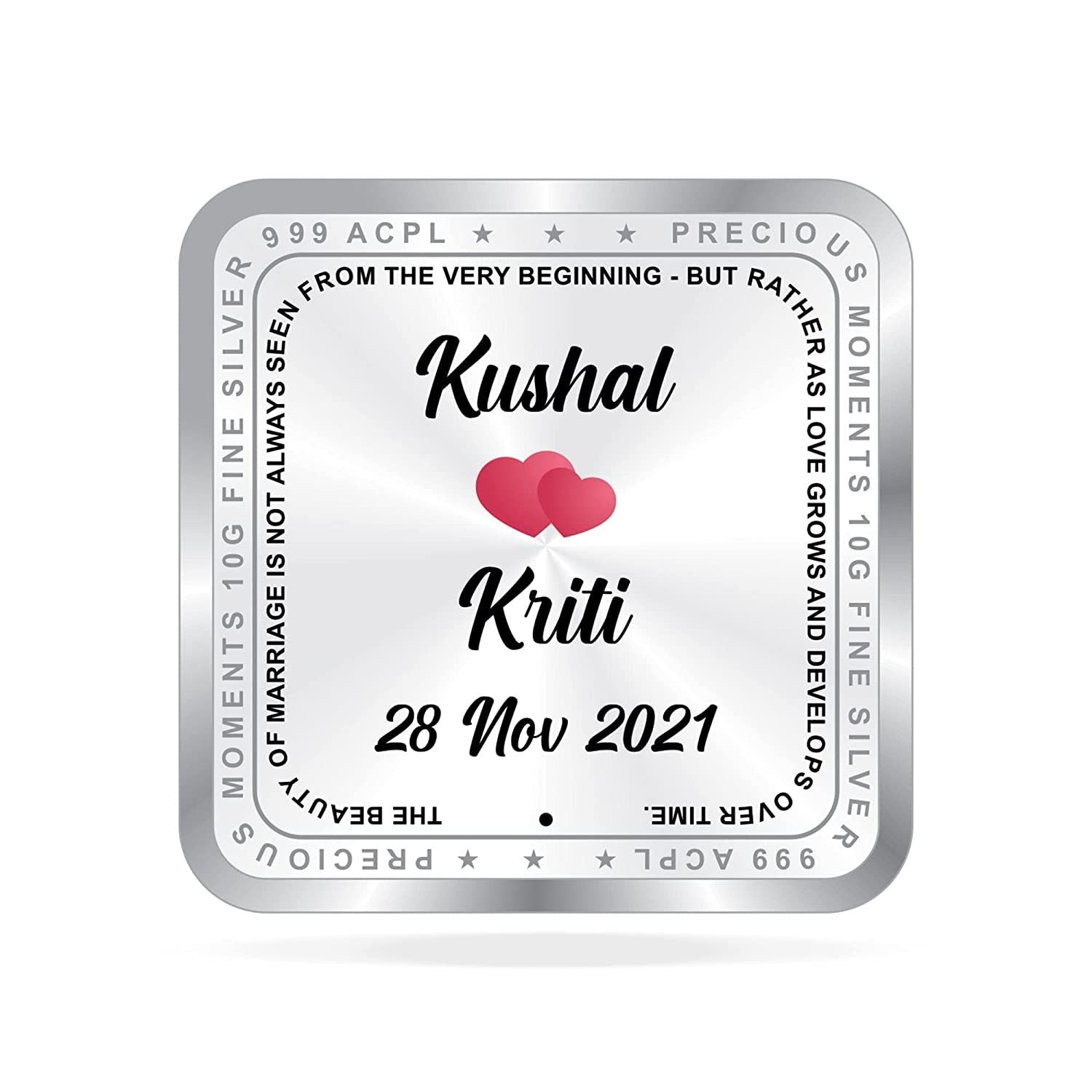 BIS Hallmarked NEWLY MARRIED COIN PERSONALISATION DETAILS: "WE TAKE ONLY PRE-PAID ORDERS" Complete your order on Truesilver.co.in, Please send us the personalization details on WhatsApp @7302002224 or Email us at info@truesilver.co.in with the following details: "True Silver Order Number, Name, Image, Year & Date" that you want on the product. This design is machine-printed and is not a sticker.
