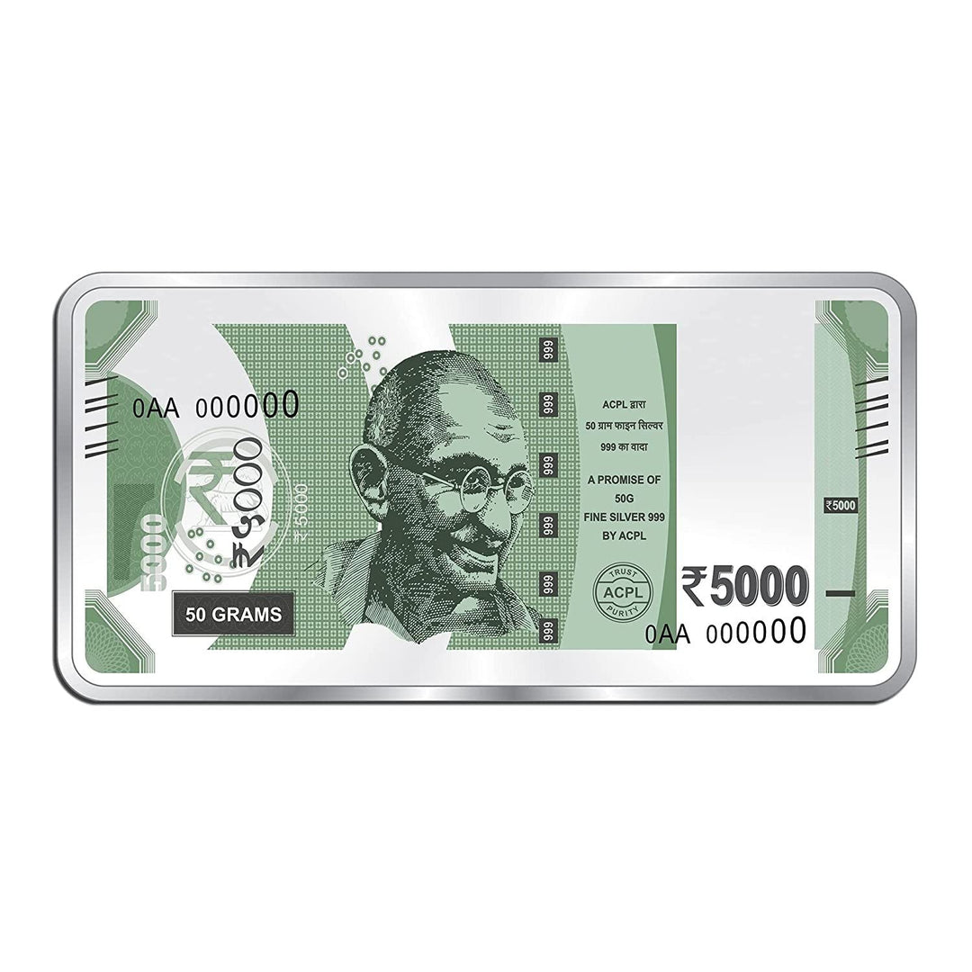 BIS Hallmarked 50 Gram Silver Currency Bar Rs.5000 999 Pure